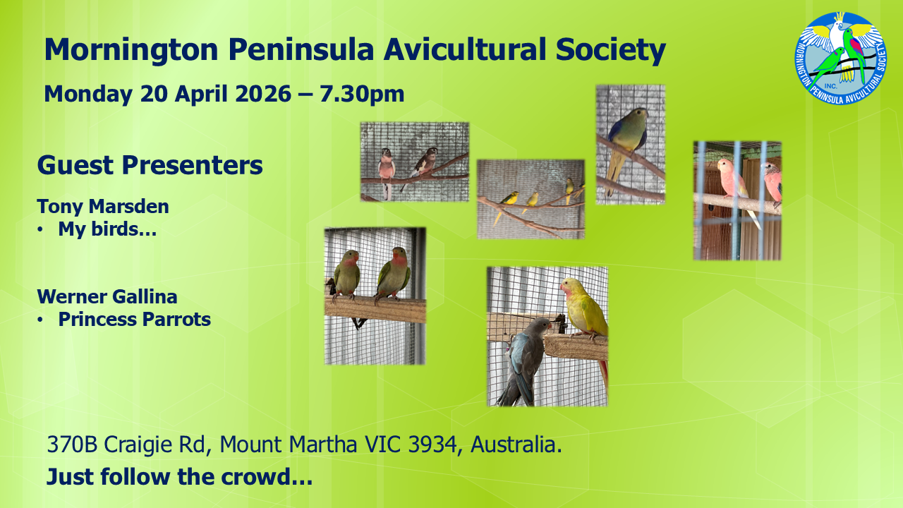 A club for all people interested in birds and birdkeeping Mornington Peninsula Avicultural Society inc Join Now Upcoming Events Learn More Learn More Explore The World of Birds Our Members are a diverse range of people from all around the world with a shared common interest – Aviculture Learn More